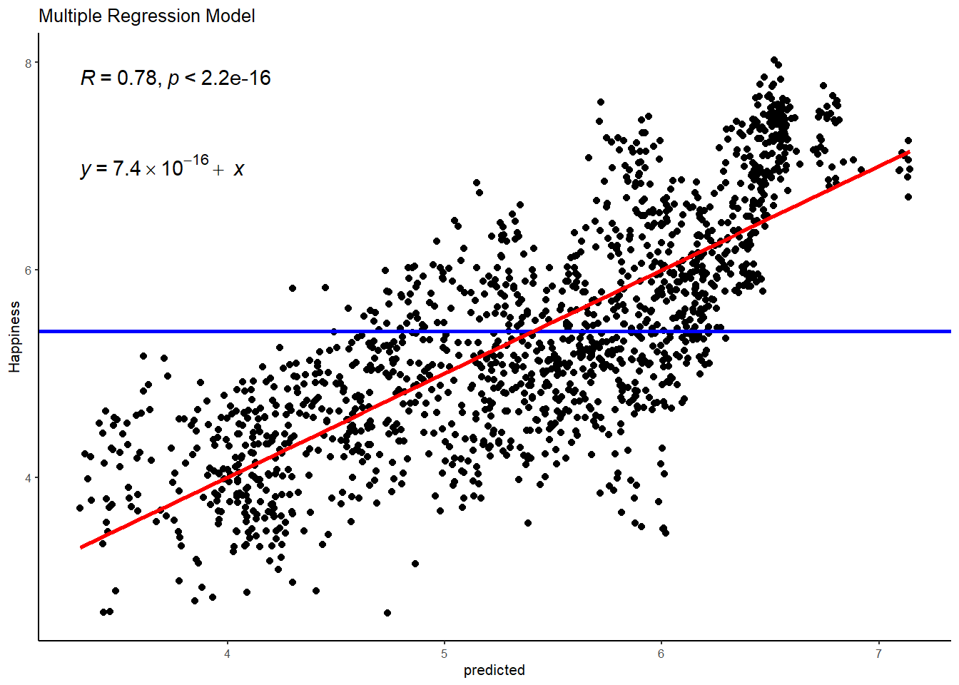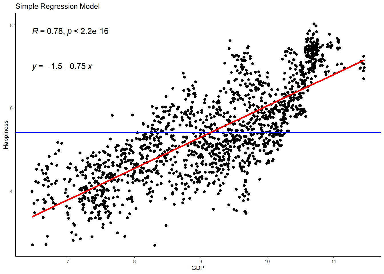 We can visualize this relationship using a scatterplot with ggplot(), whereby data points are plotted for happiness against GDP. We can also draw the best-fitting regression line, which represents the Happiness model, over the same WHR data points