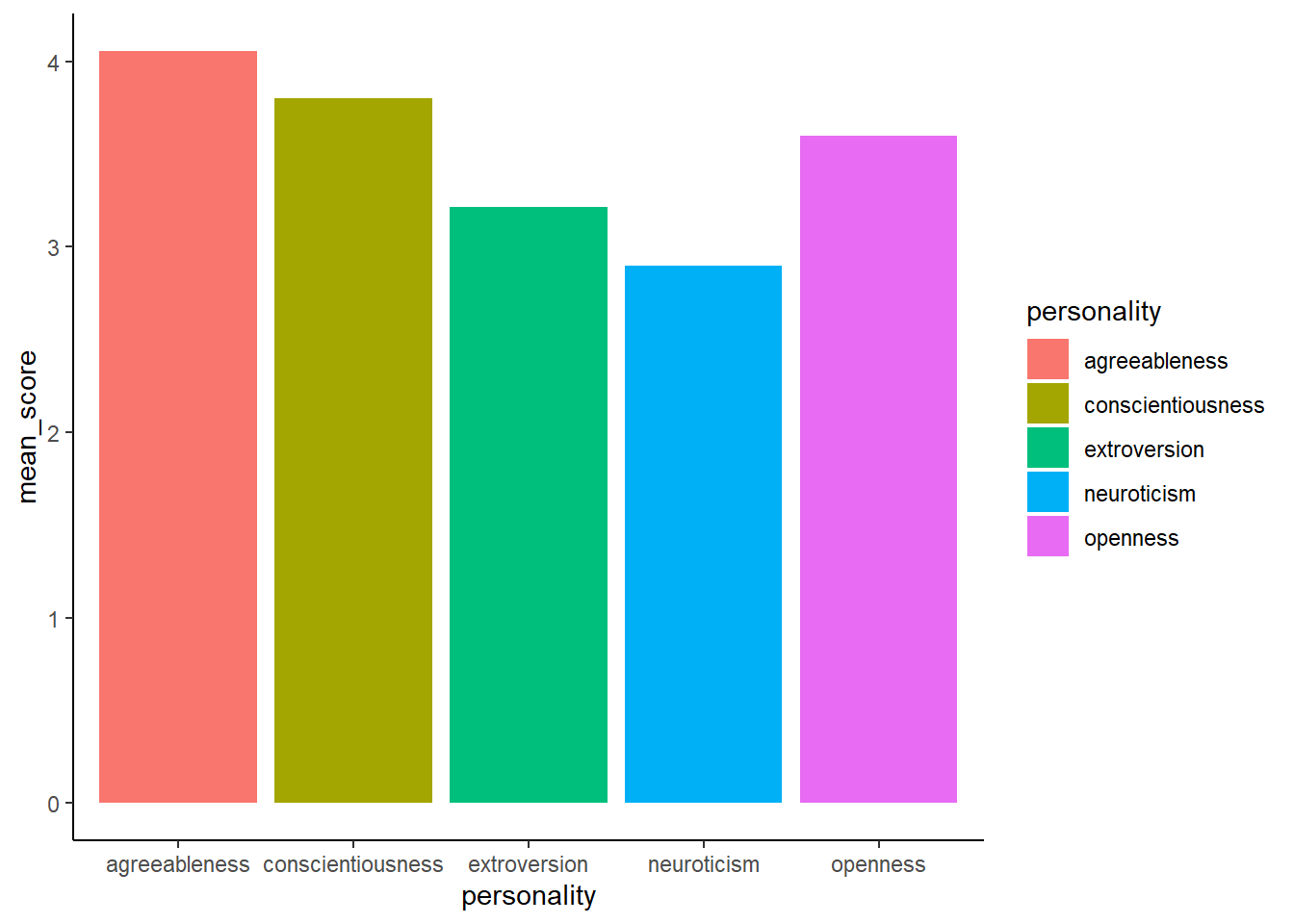 mean_score <- c(mean(bigfive$neuroticism), mean(bigfive$openness), mean(bigfive$extroversion), mean(bigfive$conscientiousness), mean(bigfive$agreeableness))