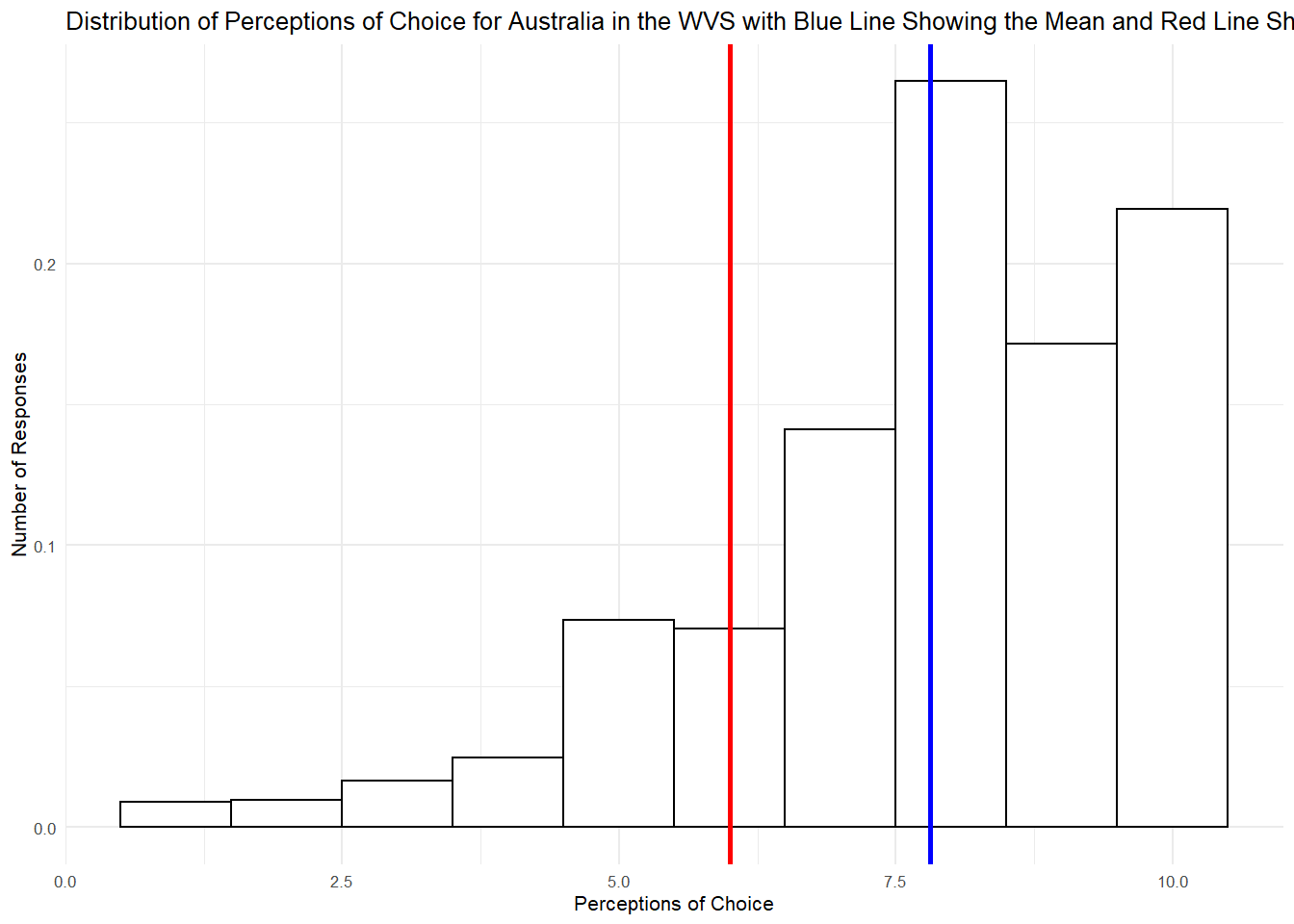 ggtitle("Distribution of Perceptions of Choice for Australia in the WVS with Blue Line Showing the Mean and Red Line Showing Jericho") +