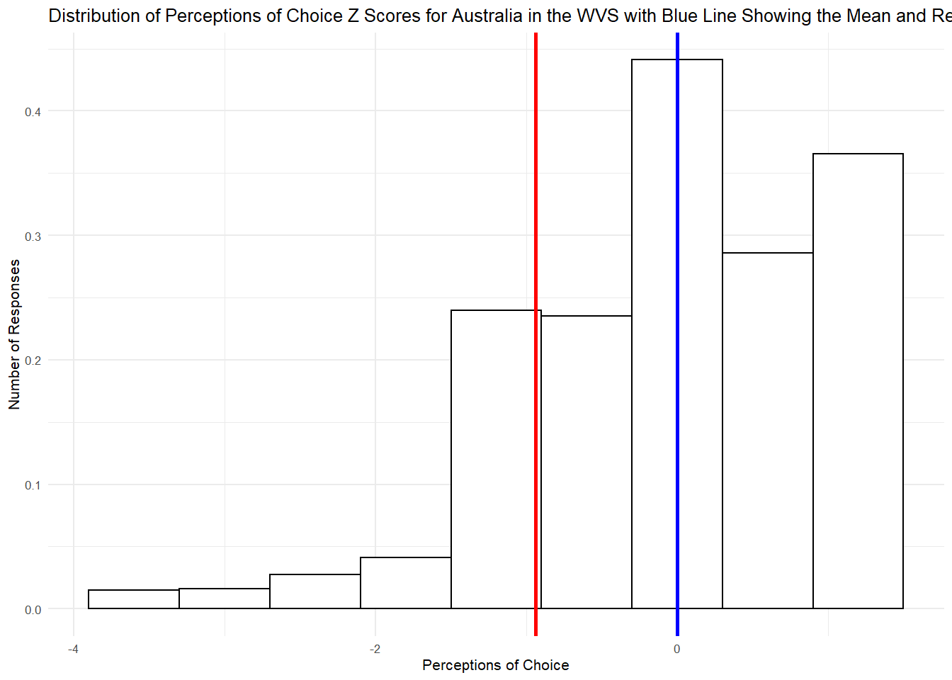 ggtitle("Distribution of Perceptions of Choice Z Scores for Australia in the WVS with Blue Line Showing the Mean and Red Line Showing Jericho") +