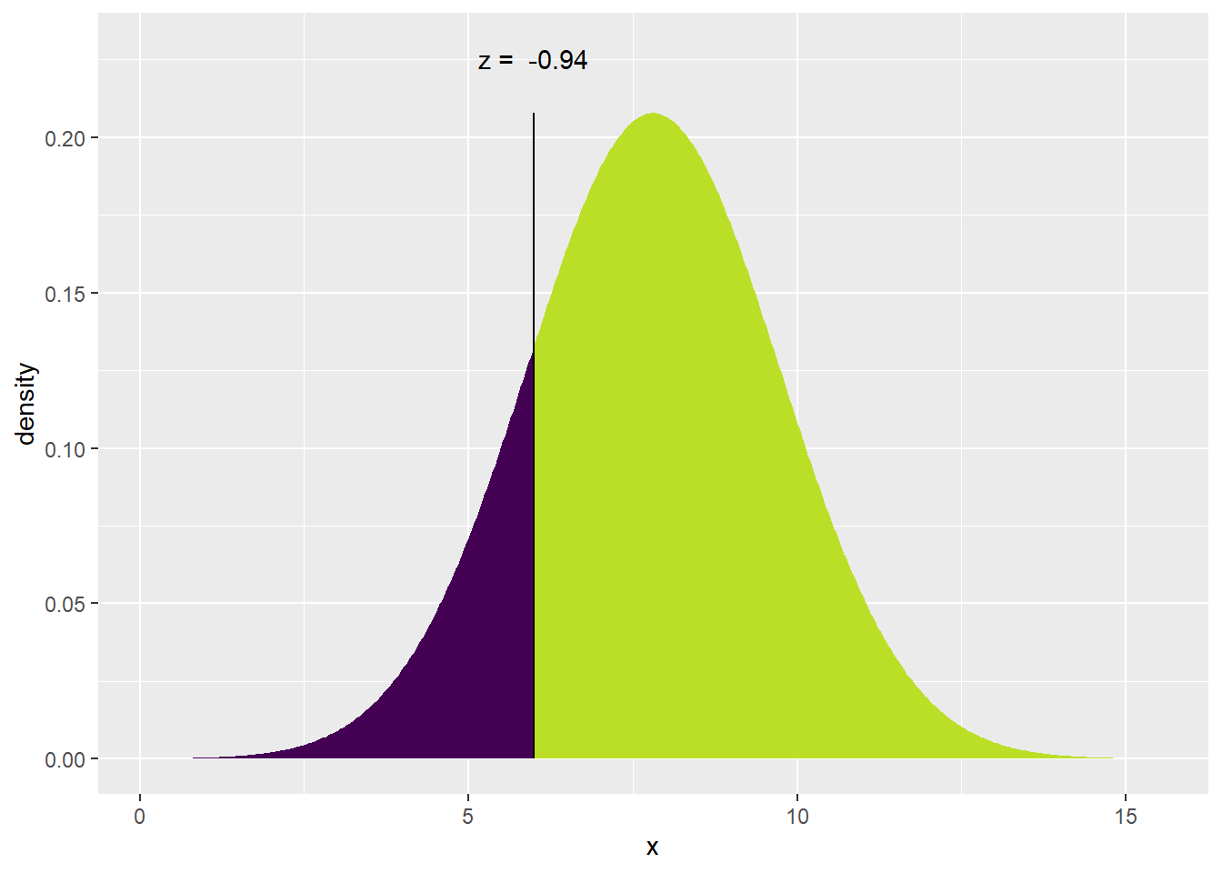 ## P(X > 6) = P(Z > -0.9427) = 0.8271