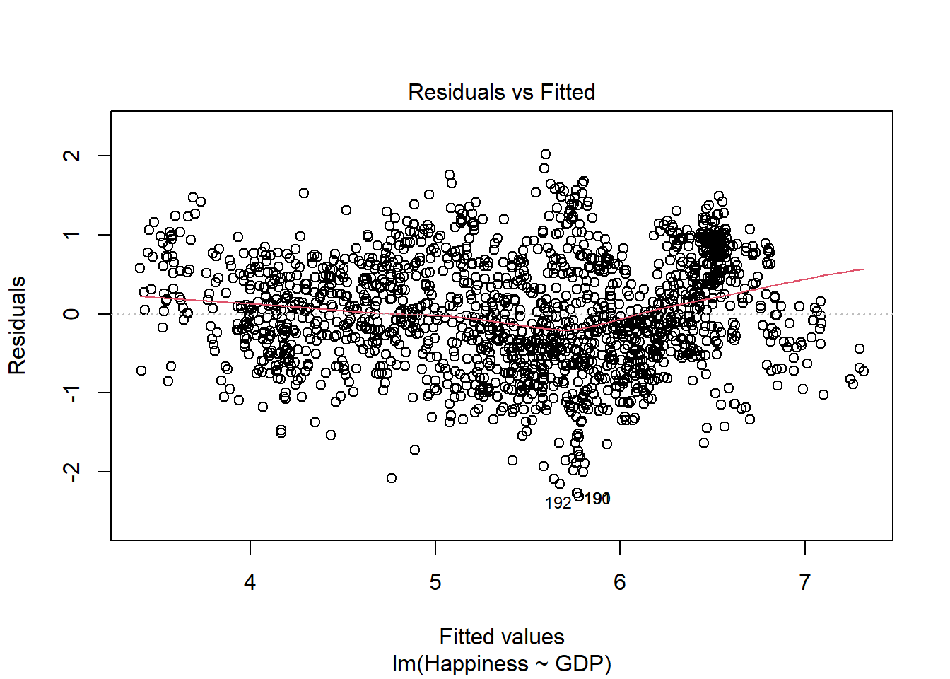 How did we do? R automatically flagged 2 data points that have large residuals (observations 192 and 190). Besides that, our residuals appear to be pretty linear, as is evidenced by the almost straight red line plotted through our residuals (if they were quadratic, for example, that line would resemble the shape of a parabola). It also looks like our data have equal variance across the range of the predictor, given that they appear evenly spread around the y = 0 line. Hooray!