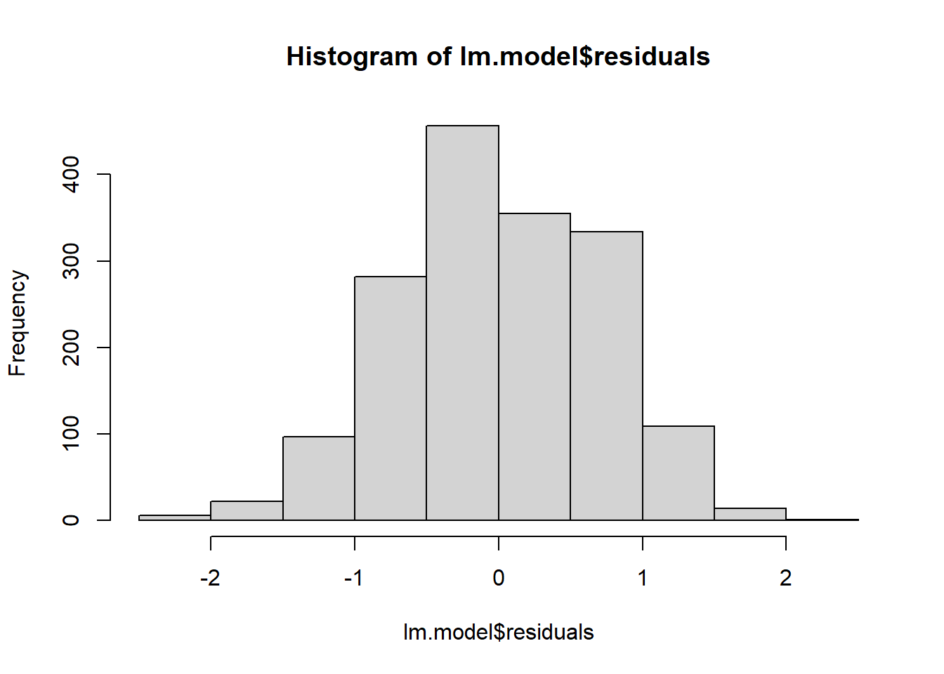 We could test this more formally, as we did for ANOVA. But regression is robust to small deviations in normality and, besides, our sample so large it will invariably turn a significant result. No need here. The residuals look pretty symmetrical.