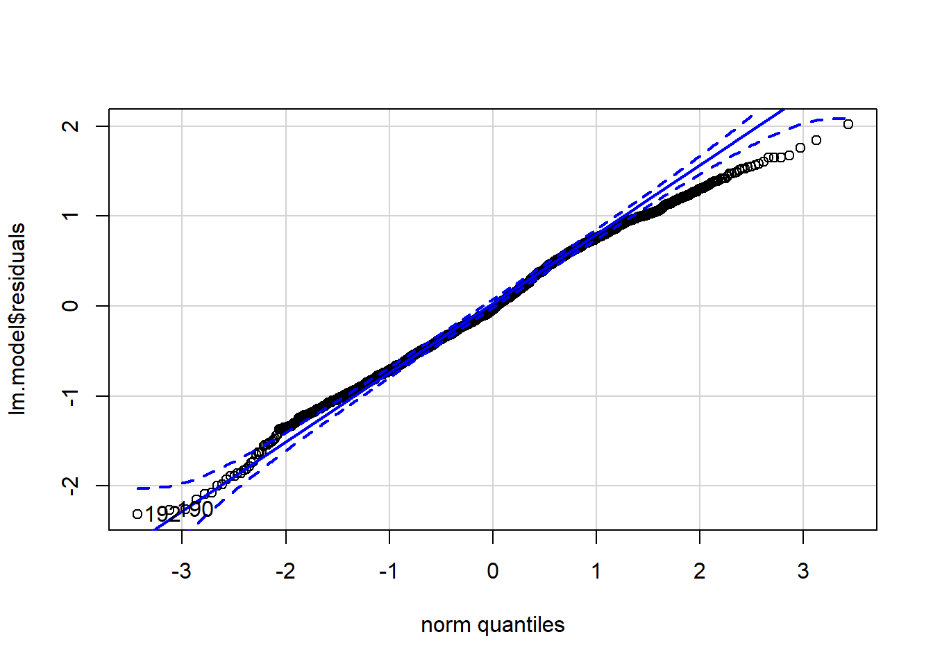 How did we do? R automatically flagged those same 2 data points that have large residuals (observations 192 and 190). However, aside from those 2 data points, observations lie well along the 45-degree line in the QQ-plot, and the histogram has a nice bell shape, so we may assume that normality holds here.