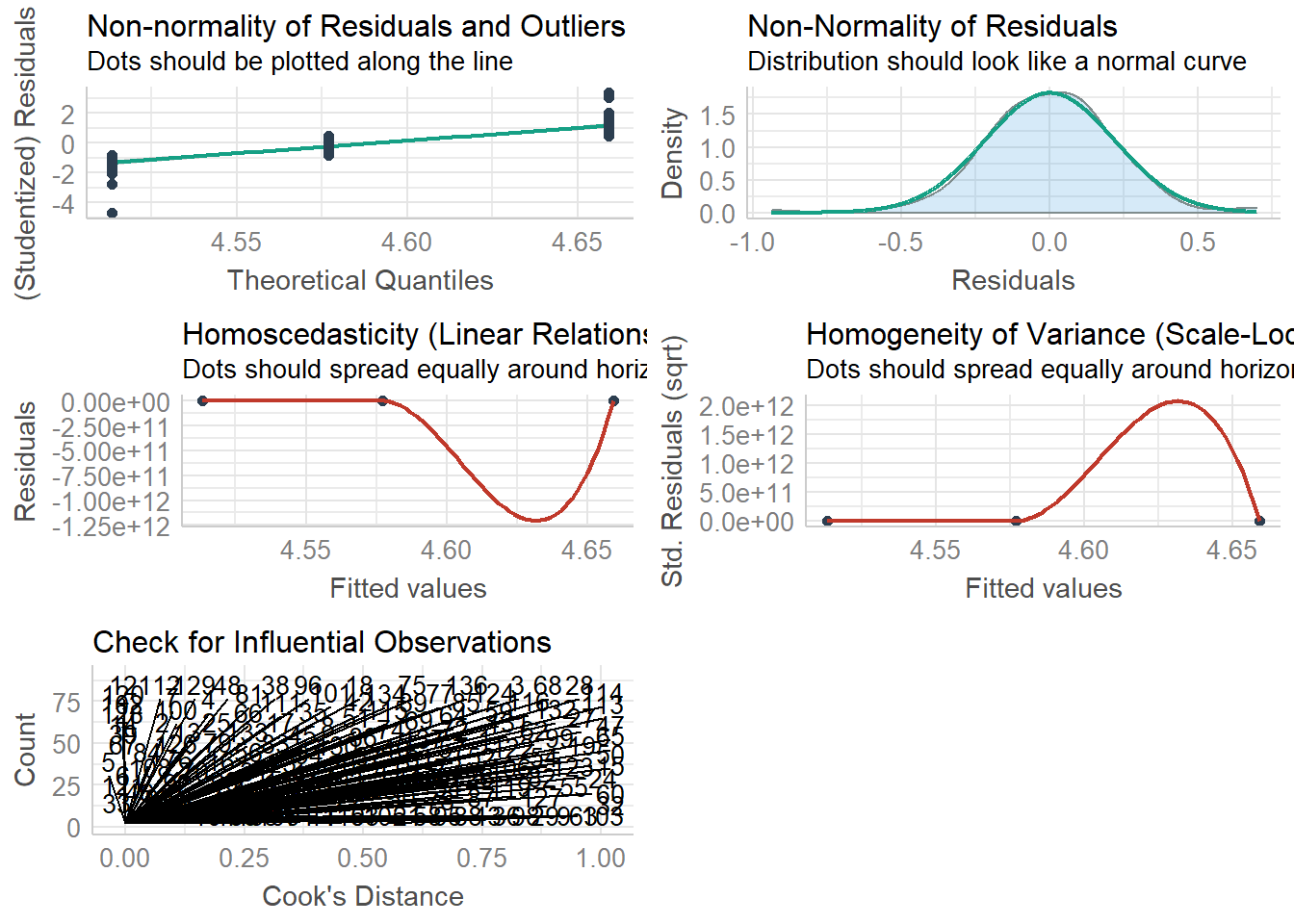Just as the other plots suggested, all of our assumptions seem to be acceptable for the linear regression model. But there are some issue of homogeneity identified for the ANOVA (which we addressed).