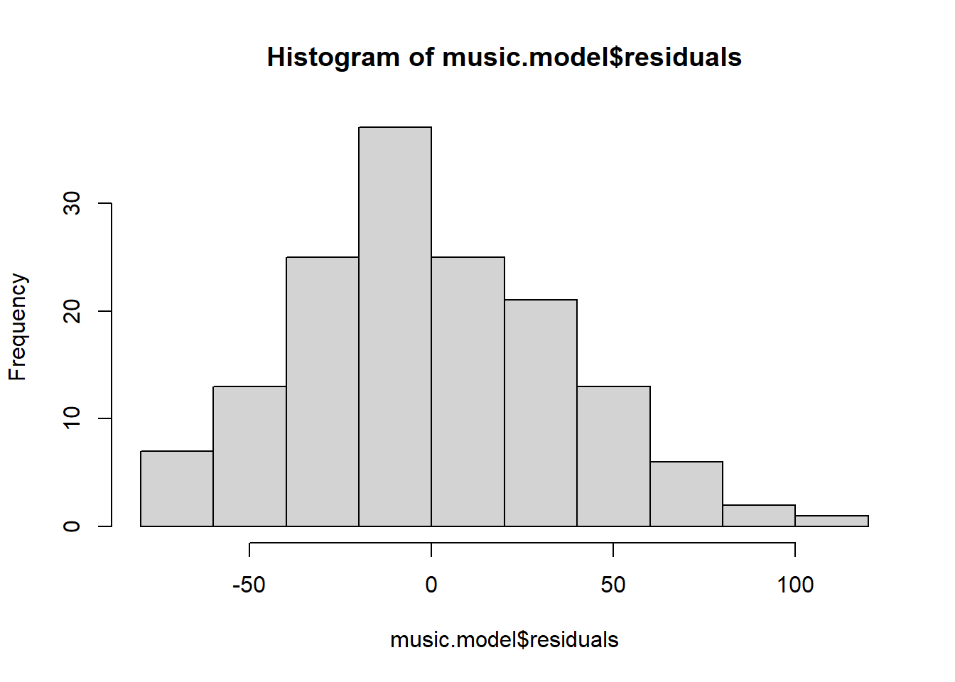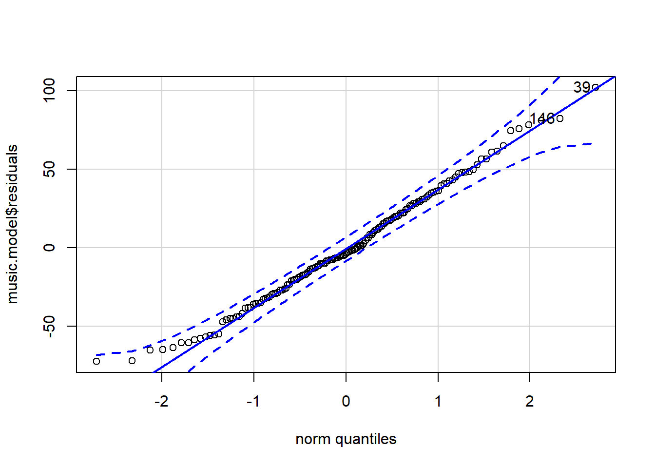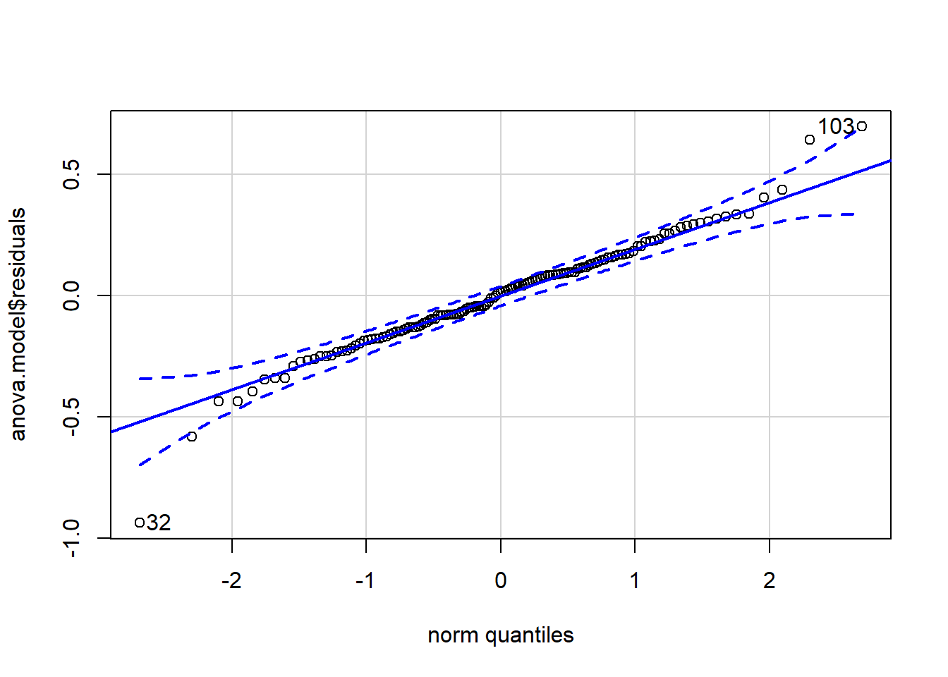 From the histogram and QQ-plot above, we can already see that the normality assumption seems to be met. Indeed, the histogram roughly forms a bell curve, indicating that the residuals follow a normal distribution. Furthermore, points in the QQ-plots roughly follow the straight line and most of them are within the confidence bands (there are a couple of outliers that R has flagged: 32 and 103). This also indicates that residuals follow approximately a normal distribution.