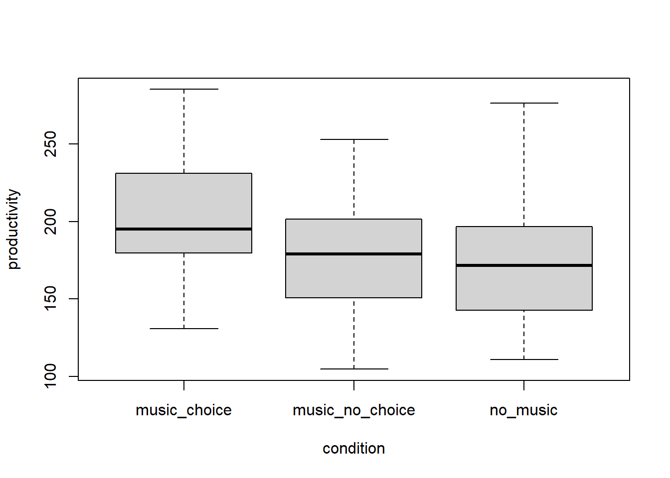 The data are taken from last years secondary data assignment. If you remember, I gave you some data from an online retailer interested in improving their workers’ productivity at work with music. To test whether music had an impact on productivity, a researcher recruited a sample of 150 and randomly split them into three groups: