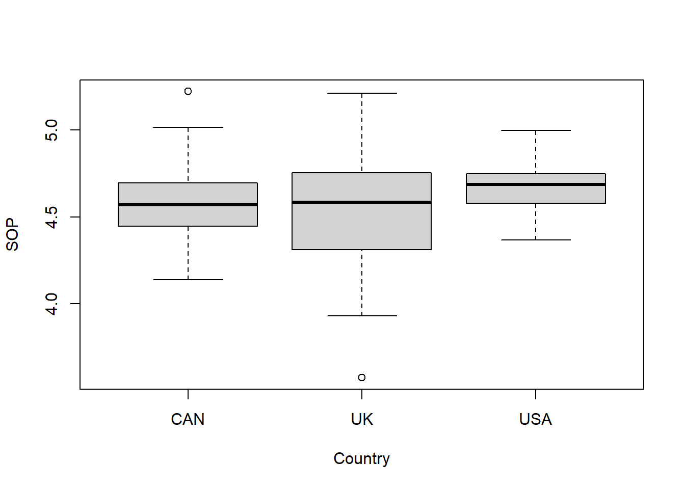 This is a classic One-Way ANOVA with three levels of the independent variable (Country) and one dependent variable (SOP). We tested this data without testing whether the assumptions of normality and equality of variances were met.