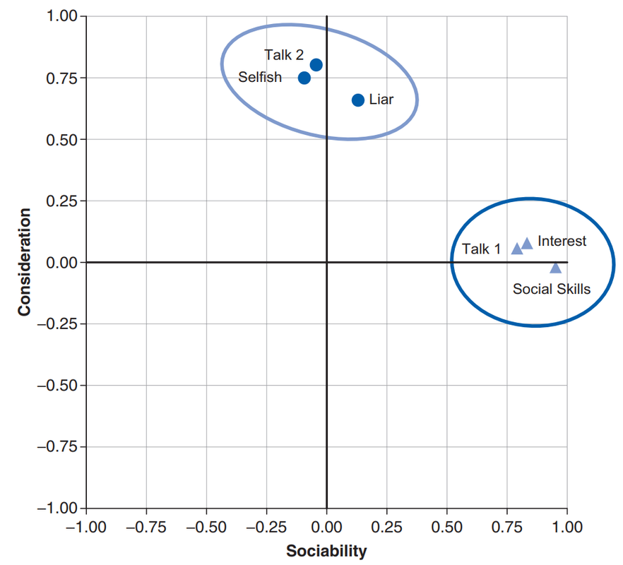 If we visualize factors as classification axes, then each variable can be plotted along with each classification axis. For example, two factors (e.g., “Sociability” and “Consideration”) can be plotted as a 2D graph, while six variables (e.g., “Selfish”) can be put at corresponding positions on the graph, as shown below. Such factor plot can be drawn after two factors have been extracted via techniques described in later section that best summarize the items into two clusters.