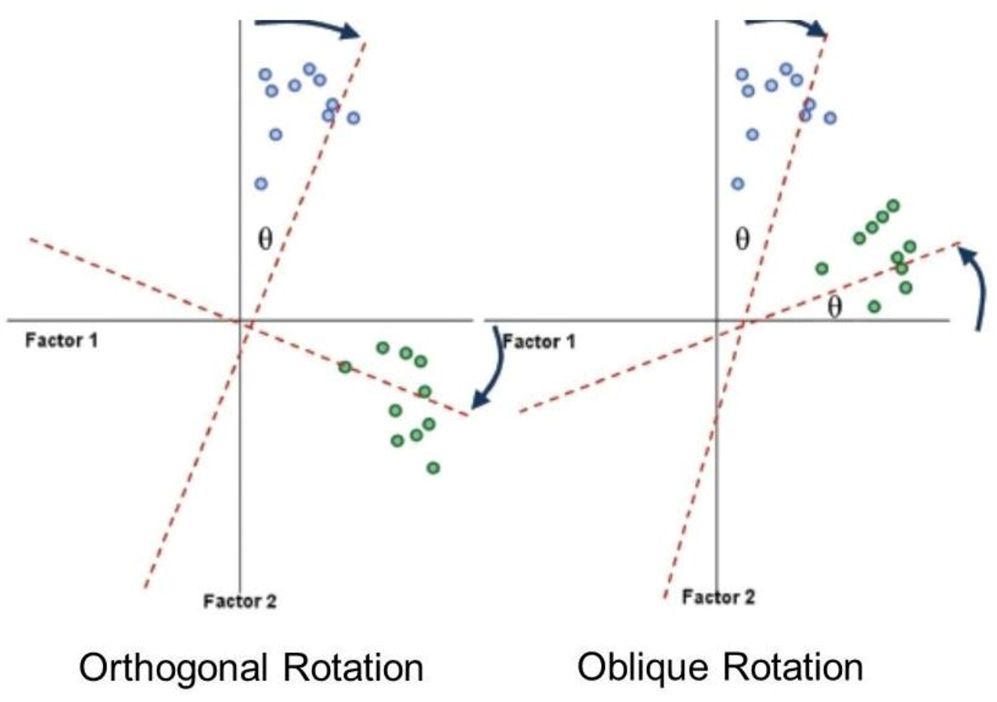 There are two types of rotation that can be done. The first is orthogonal rotation while the other is oblique rotation. The difference with oblique rotation is that the factors are allowed to correlate. We will use orthogonal rotation here, sometimes called varimax rotation.