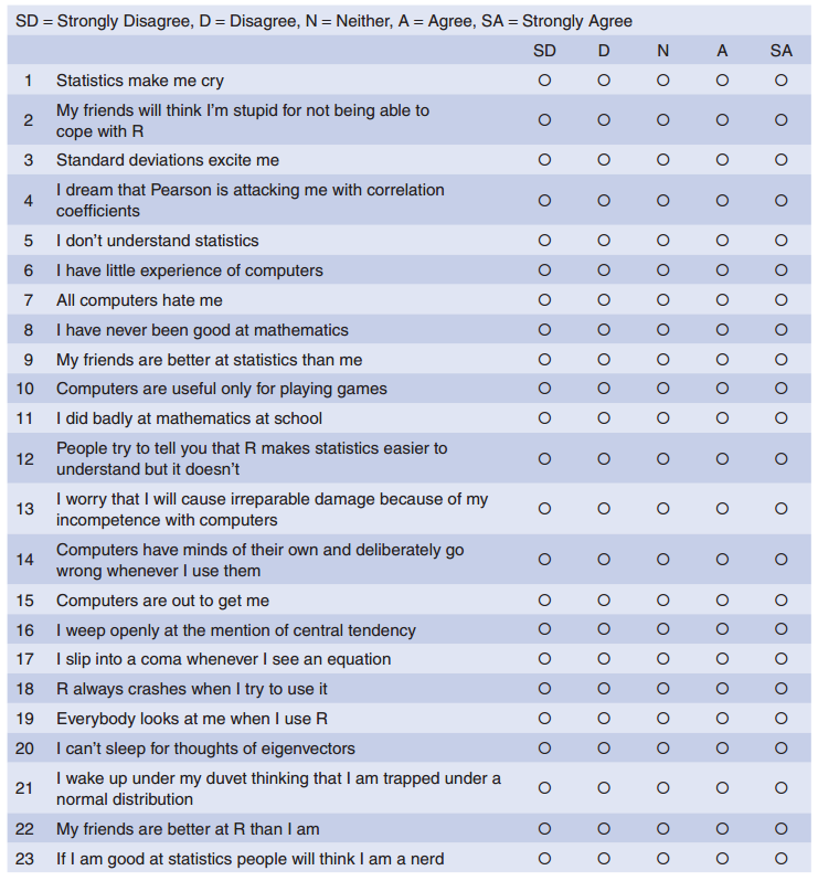 Below is the screen shot of a questionnaire of statistics anxiety (copied from the Andy Field’s book):