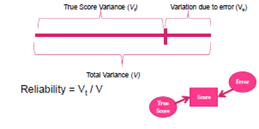Measurement error can be quantified by the proportion of the ‘true score variance’ to the ‘total variance’, where the total variance is 1.