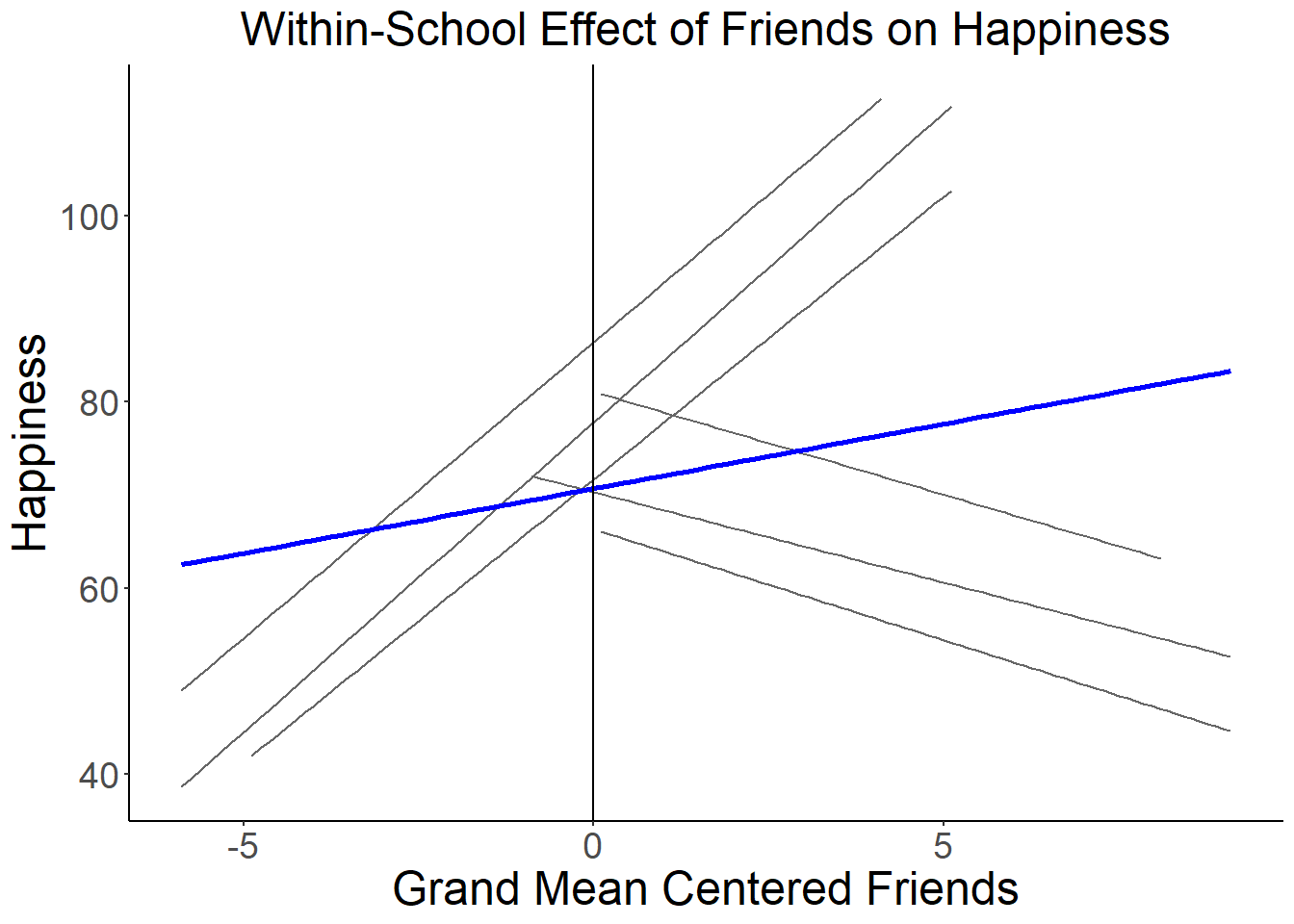 If we ran an linear regression of happiness on friends in the total dataset, we run the risk of missing potentially important clustering effects in this data. That is, given the specific characteristics of our schools, it is likely that the impact of friends on happiness will be different from school to school. Perhaps the impact of friends on happiness is greater in the poor schools than it is in the rich schools. This is a classic cse of clustering. We need to add the appropriate random effects of schools to our regression model.
