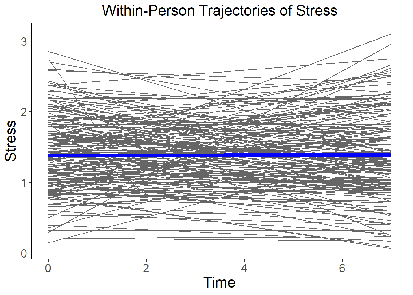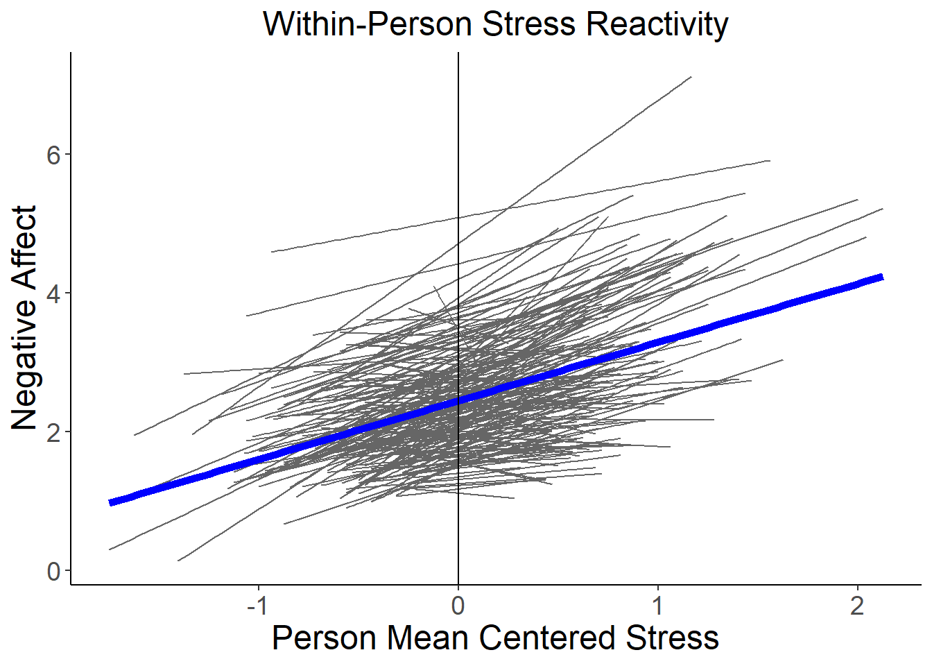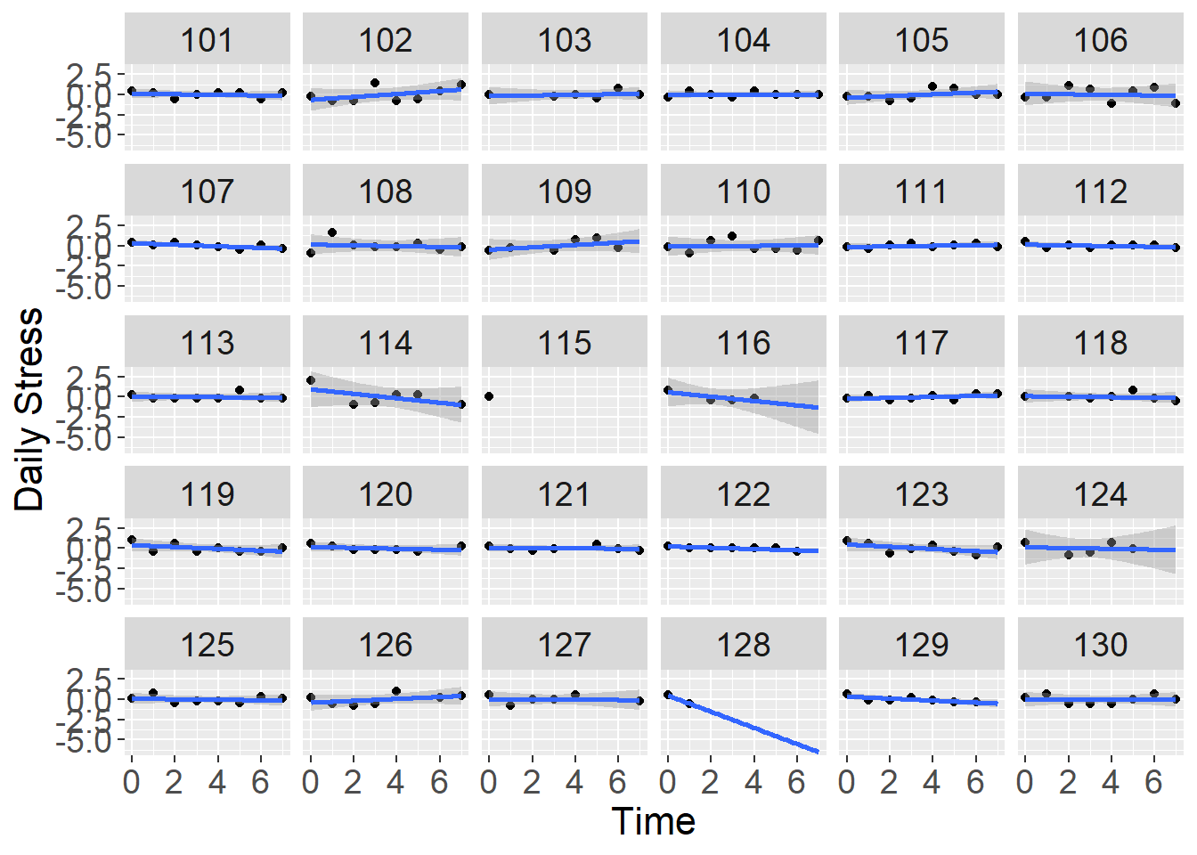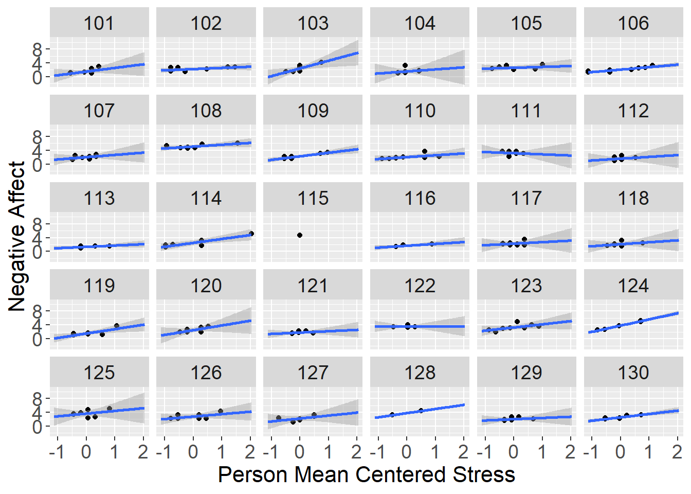 From the panel of plots we get a sense that individuals’ negative affect is higher on days where their stress is higher, but to a different extent for each person. These differences in stress reactivity are indicated by differences in the slope of the regression lines.