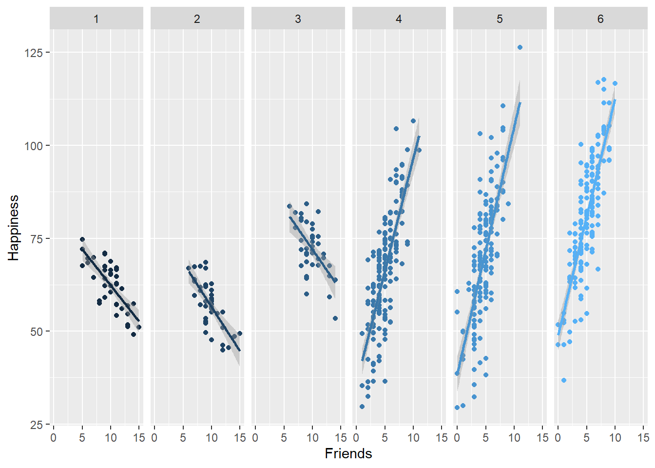 To visualize the relationships across the schools in our data set, lets first plot the within-school relationships between friends and happiness. To do this, we just plot friends against happiness and group the plots by school: