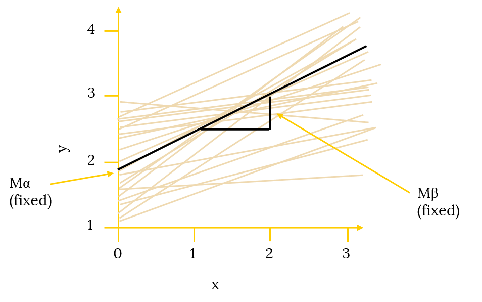 For each case, the outcome or “y” score can be separated into fixed and random effects. The fixed effects include the intercept (a) and the slope (B) for the independent variable “X.” These are considered fixed because they take on set values (i.e., the mean intercept of all possible intercepts and the mean slope of all possible slopes).